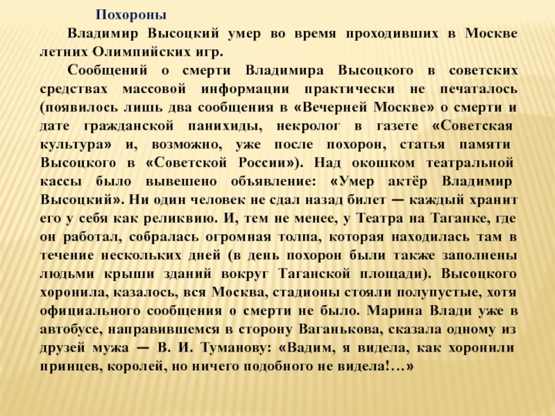 о смерти Владимира Высоцкого в советских средствах массовой информации практически не печаталось (появилось лишь два сообщения в «Вечерней Москве» о смерти и дате гражданской панихиды, некролог в газете «Советская культура» и, возможно, уже после похорон, статья памяти Высоцкого в «Советской России»). Над окошком театральной кассы было вывешено объявление: «Умер актёр Владимир Высоцкий». Ни один человек не сдал назад билет — каждый хранит его у себя как реликвию. И, тем не менее, у Театра на Таганке, где он работал, собралась огромная толпа, которая находилась там в течение нескольких дней (в день похорон были также заполнены людьми крыши зданий вокруг Таганской площади). Высоцкого хоронила, казалось, вся Москва, стадионы стояли полупустые, хотя официального сообщения о смерти не было. Марина Влади уже в автобусе, направившемся в сторону Ваганькова, сказала одному из друзей мужа — В. И. Туманову: «Вадим, я видела, как хоронили принцев, королей, но ничего подобного не видела!…»