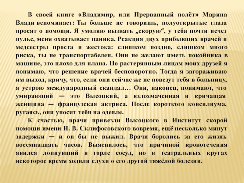 В июне 1968 года В.Высоцкий послал письмо в ЦК КПСС в связи с резкой критикой его ранних песен в центральных газетах. В том же году вышла его первая авторская грампластинка «Песни из кинофильма „Вертикаль“». Летом 1969 года у Высоцкого был тяжелый приступ, и тогда он выжил только благодаря Марине Влади. Она в это время была в Москве. Проходя мимо ванной, она услышала стоны и увидела, что Высоцкий кровоточит горлом.