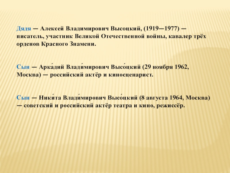 Слайд 5Дядя — Алексей Владимирович Высоцкий, (1919—1977) — писатель, участник Великой Отечественной