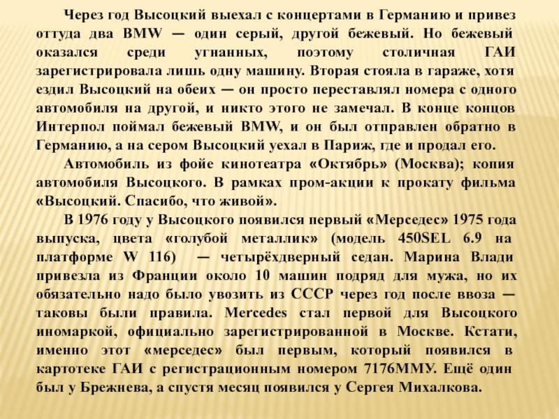 два BMW — один серый, другой бежевый. Но бежевый оказался среди угнанных, поэтому столичная ГАИ зарегистрировала лишь одну машину. Вторая стояла в гараже, хотя ездил Высоцкий на обеих — он просто переставлял номера с одного автомобиля на другой, и никто этого не замечал. В конце концов Интерпол поймал бежевый BMW, и он был отправлен обратно в Германию, а на сером Высоцкий уехал в Париж, где и продал его.