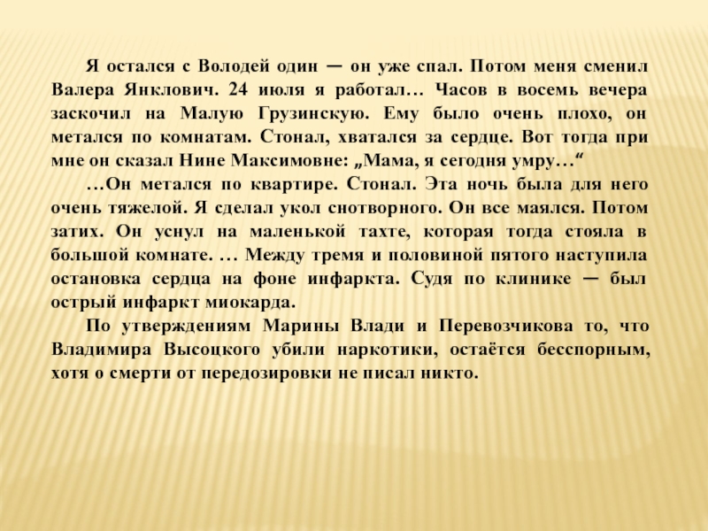 сменил Валера Янклович. 24 июля я работал… Часов в восемь вечера заскочил на Малую Грузинскую. Ему было очень плохо, он метался по комнатам. Стонал, хватался за сердце. Вот тогда при мне он сказал Нине Максимовне: „Мама, я сегодня умру…“