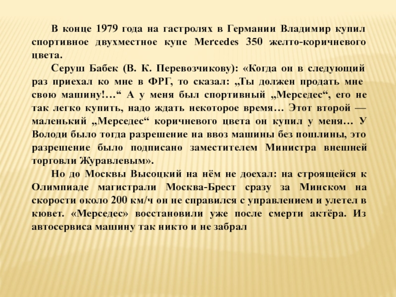 Серуш Бабек (В. К. Перевозчикову): «Когда он в следующий раз приехал ко мне в ФРГ, то сказал: „Ты должен продать мне свою машину!…“ А у меня был спортивный „Мерседес“, его не так легко купить, надо ждать некоторое время… Этот второй — маленький „Мерседес“ коричневого цвета он купил у меня… У Володи было тогда разрешение на ввоз машины без пошлины, это разрешение было подписано заместителем Министра внешней торговли Журавлевым».
