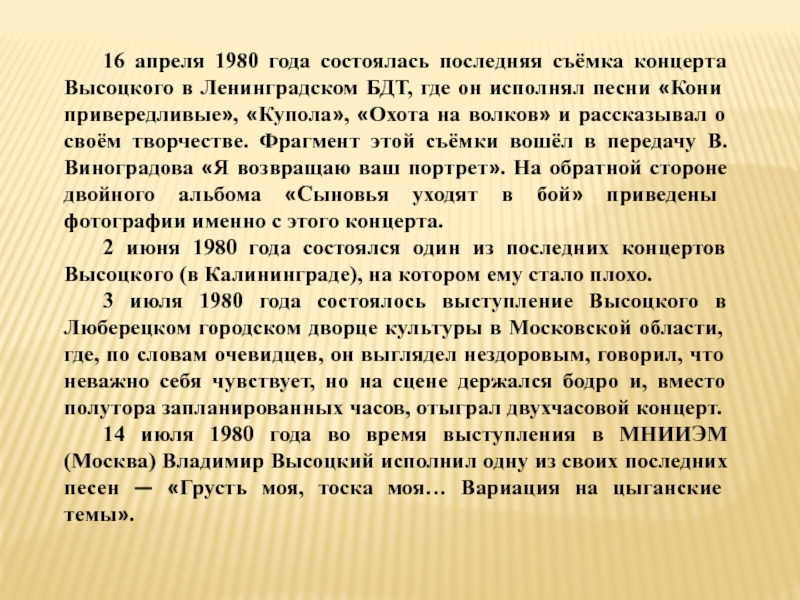 16 апреля 1980 года состоялась последняя съёмка концерта Высоцкого в Ленинградском
