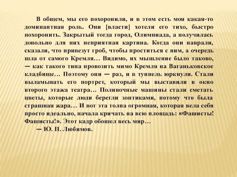 доминантная роль. Они [власти] хотели его тихо, быстро похоронить. Закрытый тогда город, Олимпиада, а получилась довольно для них неприятная картина. Когда они наврали, сказали, что привезут гроб, чтобы проститься с ним, а очередь шла от самого Кремля… Видимо, их мышление было таково, — как такого типа провозить мимо Кремля на Ваганьковское кладбище… Поэтому они — раз, и в туннель юркнули. Стали выламывать его портрет, который мы выставили в окно второго этажа театра… Поливочные машины стали сметать цветы, которые люди берегли зонтиками, потому что была страшная жара… И вот эта толпа огромная, которая вела себя просто идеально, начала кричать на всю площадь: «Фашисты! Фашисты!». Этот кадр обошел весь мир…