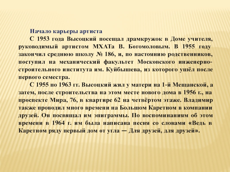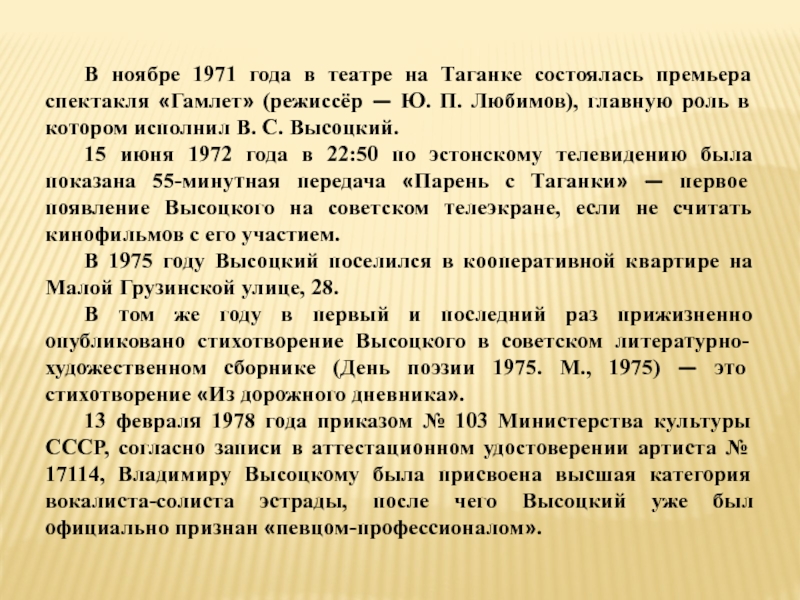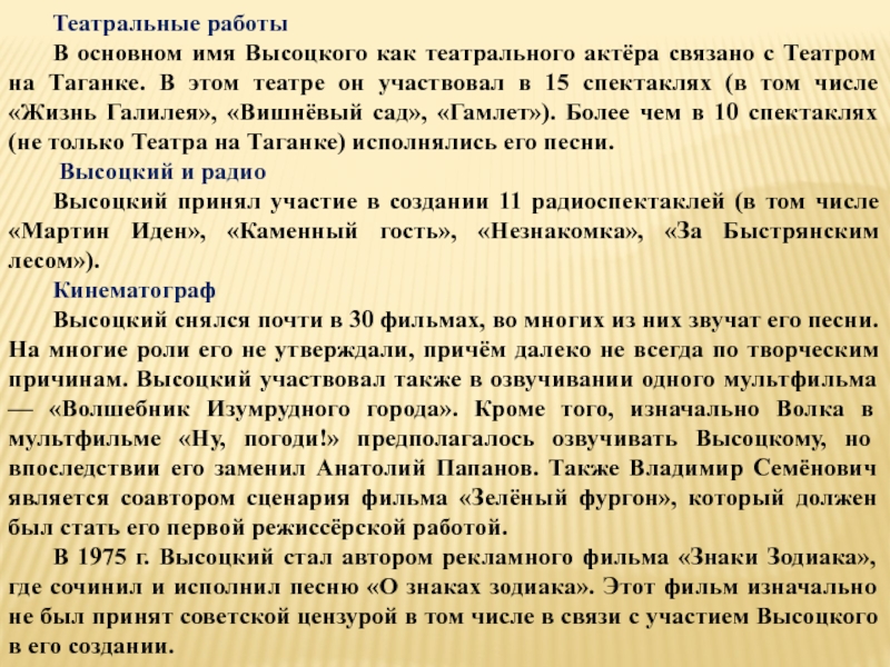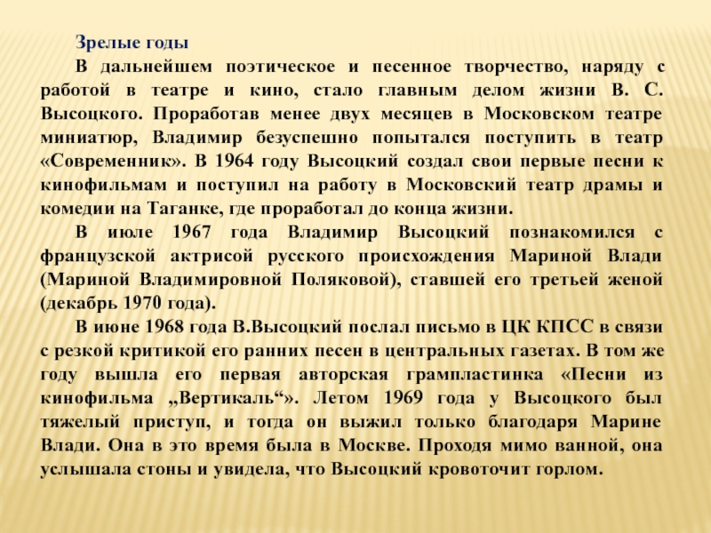 театре и кино, стало главным делом жизни В. С. Высоцкого. Проработав менее двух месяцев в Московском театре миниатюр, Владимир безуспешно попытался поступить в театр «Современник». В 1964 году Высоцкий создал свои первые песни к кинофильмам и поступил на работу в Московский театр драмы и комедии на Таганке, где проработал до конца жизни.