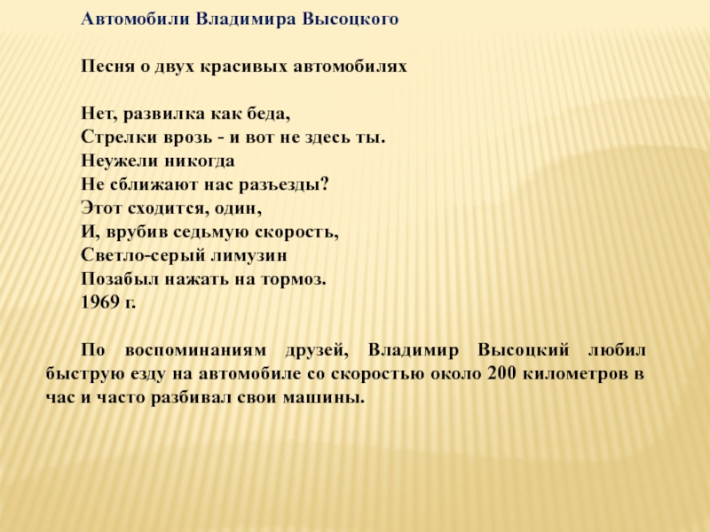По воспоминаниям друзей, Владимир Высоцкий любил быструю езду на автомобиле со скоростью около 200 километров в час и часто разбивал свои машины.
