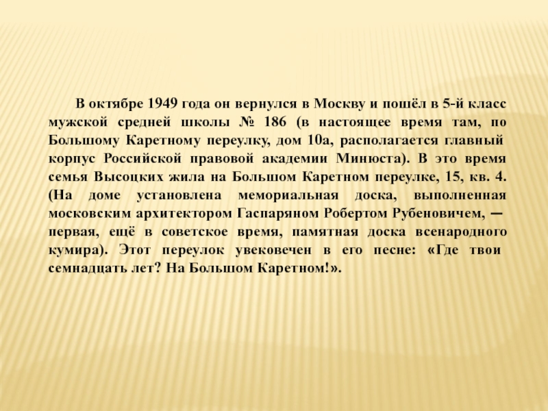 5-й класс мужской средней школы № 186 (в настоящее время там, по Большому Каретному переулку, дом 10а, располагается главный корпус Российской правовой академии Минюста). В это время семья Высоцких жила на Большом Каретном переулке, 15, кв. 4. (На доме установлена мемориальная доска, выполненная московским архитектором Гаспаряном Робертом Рубеновичем, — первая, ещё в советское время, памятная доска всенародного кумира). Этот переулок увековечен в его песне: «Где твои семнадцать лет? На Большом Каретном!».