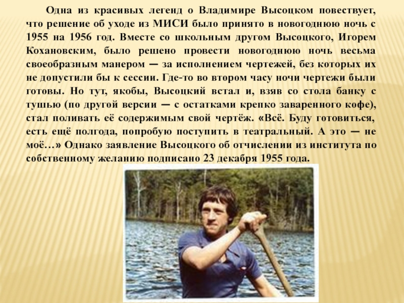 уходе из МИСИ было принято в новогоднюю ночь с 1955 на 1956 год. Вместе со школьным другом Высоцкого, Игорем Кохановским, было решено провести новогоднюю ночь весьма своеобразным манером — за исполнением чертежей, без которых их не допустили бы к сессии. Где-то во втором часу ночи чертежи были готовы. Но тут, якобы, Высоцкий встал и, взяв со стола банку с тушью (по другой версии — с остатками крепко заваренного кофе), стал поливать её содержимым свой чертёж. «Всё. Буду готовиться, есть ещё полгода, попробую поступить в театральный. А это — не моё…» Однако заявление Высоцкого об отчислении из института по собственному желанию подписано 23 декабря 1955 года.