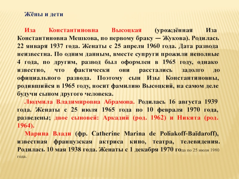 В июле 1967 года Владимир Высоцкий познакомился с французской актрисой русского происхождения Мариной Влади (Мариной Владимировной Поляковой), ставшей его третьей женой (декабрь 1970 года).