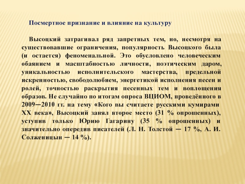 несмотря на существовавшие ограничения, популярность Высоцкого была (и остается) феноменальной. Это обусловлено человеческим обаянием и масштабностью личности, поэтическим даром, уникальностью исполнительского мастерства, предельной искренностью, свободолюбием, энергетикой исполнения песен и ролей, точностью раскрытия песенных тем и воплощения образов. Не случайно по итогам опроса ВЦИОМ, проведённого в 2009—2010 гг. на тему «Кого вы считаете русскими кумирами ХХ века», Высоцкий занял второе место (31 % опрошенных), уступив только Юрию Гагарину (35 % опрошенных) и значительно опередив писателей (Л. Н. Толстой — 17 %, А. И. Солженицын — 14 %).