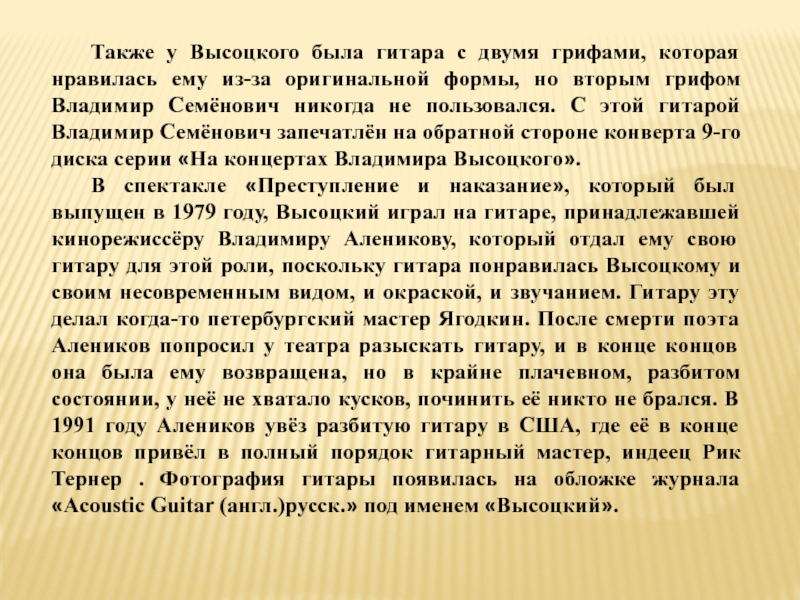 Слайд 37Также у Высоцкого была гитара с двумя грифами, которая нравилась ему