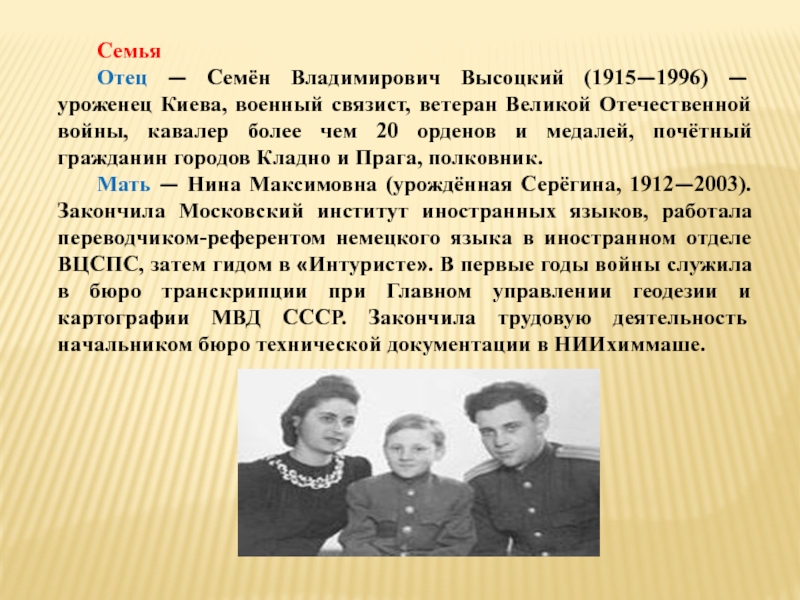 Отец — Семён Владимирович Высоцкий (1915—1996) — уроженец Киева, военный связист,