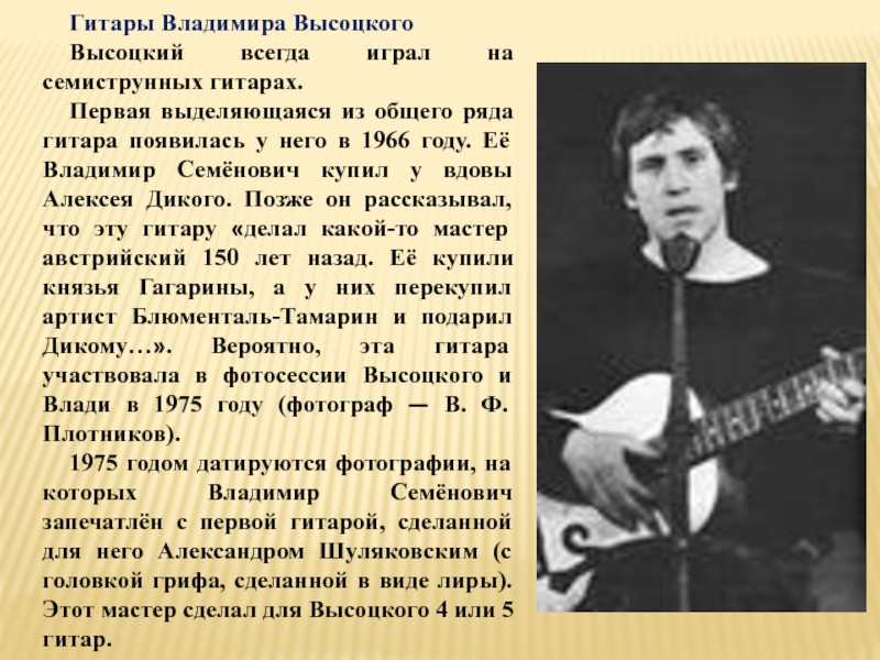 1975 годом датируются фотографии, на которых Владимир Семёнович запечатлён с первой гитарой, сделанной для него Александром Шуляковским (с головкой грифа, сделанной в виде лиры). Этот мастер сделал для Высоцкого 4 или 5 гитар.