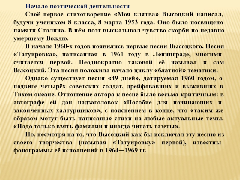 Своё первое стихотворение «Моя клятва» Высоцкий написал, будучи учеником