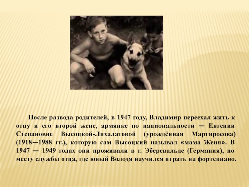 Слайд 8После развода родителей, в 1947 году, Владимир переехал жить к отцу