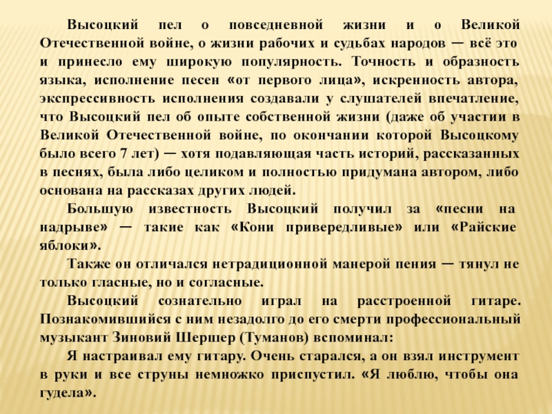 Слайд 32Высоцкий пел о повседневной жизни и о Великой Отечественной войне, о