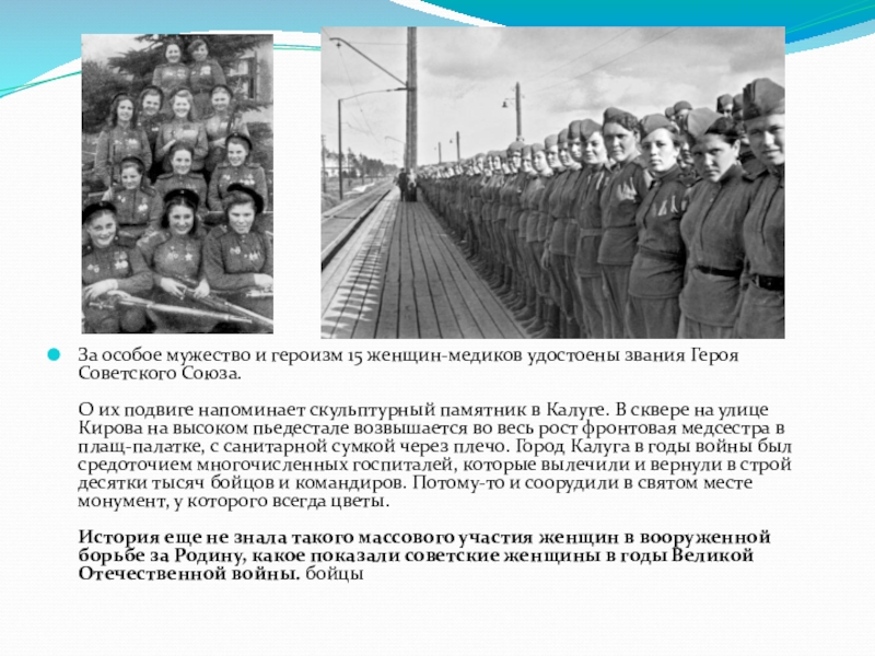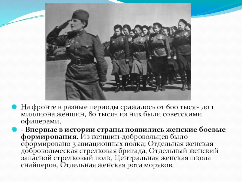 История еще не знала такого массового участия женщин в вооруженной борьбе за Родину, какое показали советские женщины в годы Великой Отечественной войны. бойцы