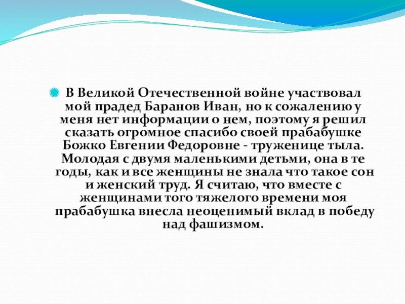 Слайд 2В Великой Отечественной войне участвовал мой прадед Баранов Иван, но к