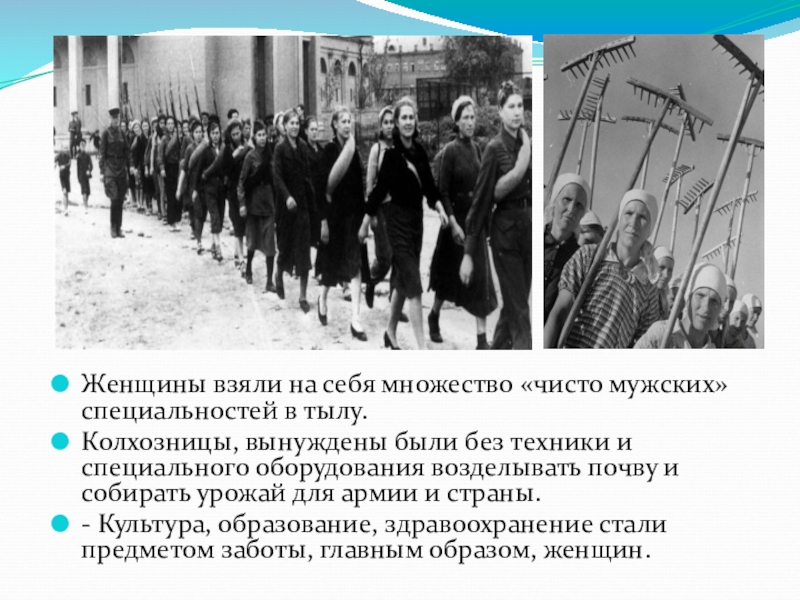 Слайд 3Женщины взяли на себя множество «чисто мужских» специальностей в тылу.