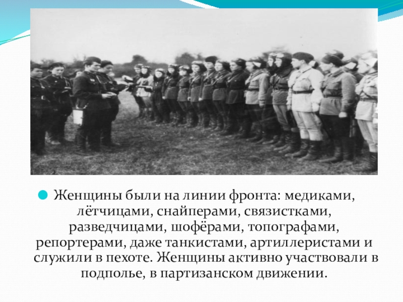 Слайд 4Женщины были на линии фронта: медиками, лётчицами, снайперами, связистками, разведчицами, шофёрами,