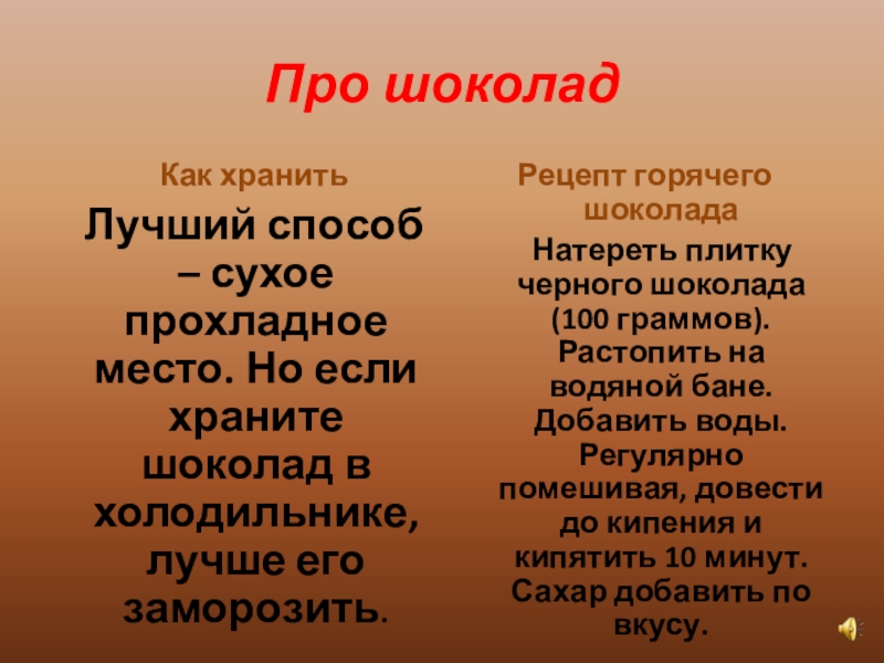 Натереть плитку черного шоколада (100 граммов). Растопить на водяной бане. Добавить воды. Регулярно помешивая, довести до кипения и кипятить 10 минут. Сахар добавить по вкусу.