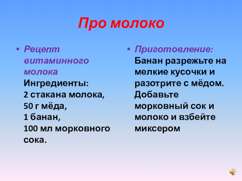 Банан разрежьте на мелкие кусочки и разотрите с мёдом. Добавьте морковный сок и молоко и взбейте миксером