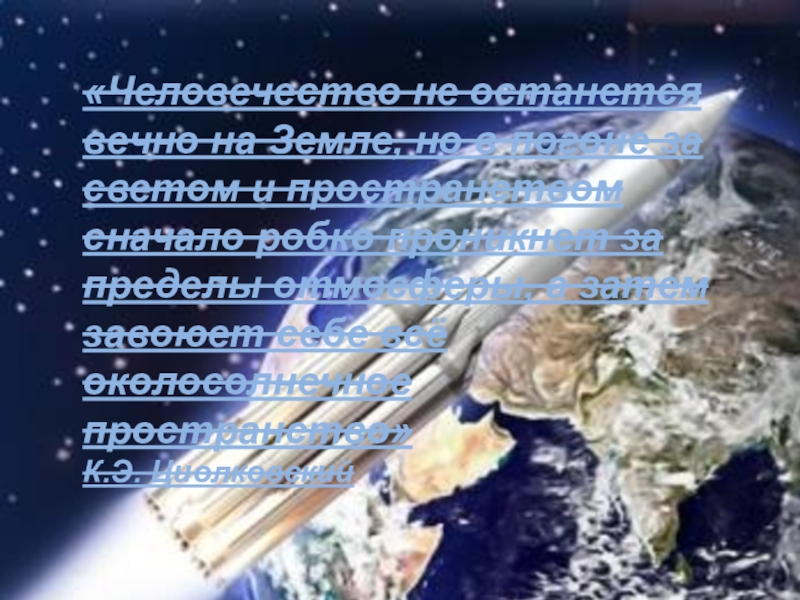Слайд 2«Человечество не останется вечно на Земле, но в погоне за светом