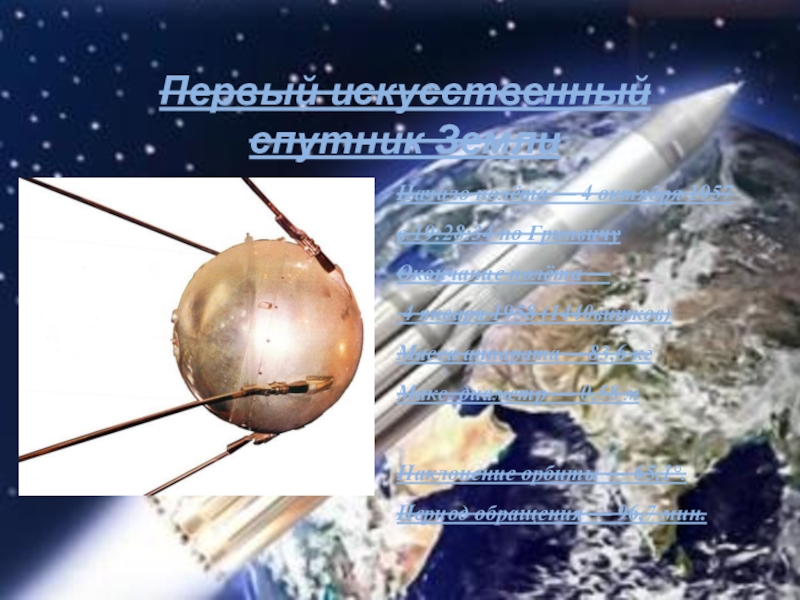 Первый искусственный спутник ЗемлиНачало полёта — 4 октября 1957в 19:28:34 по ГринвичуОкончание полёта — 4 января 1958 (1440витков)Масса аппарата —83,6 кгМакс. диаметр — 0,58 мНаклонение орбиты — 65,1°.Период