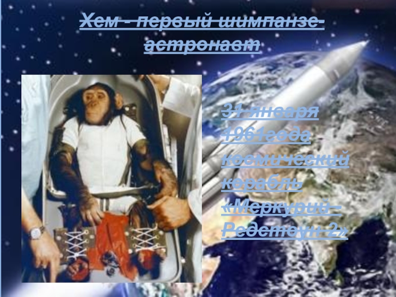 Хем - первый шимпанзе-астронавт31 января1961годакосмический корабль «Меркурий - Редстоун 2»