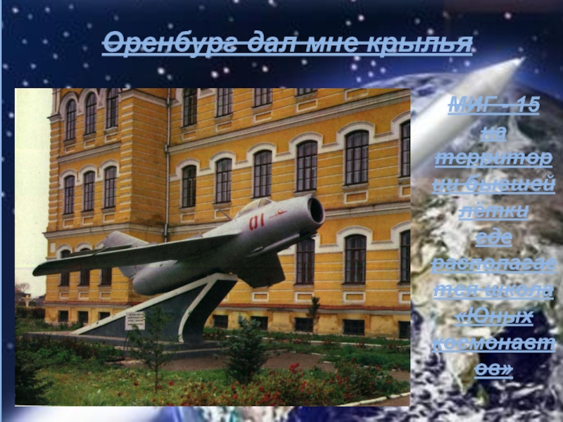 Оренбург дал мне крыльяМИГ - 15на территории бывшей лёткигде располагается школа «Юных космонавтов»