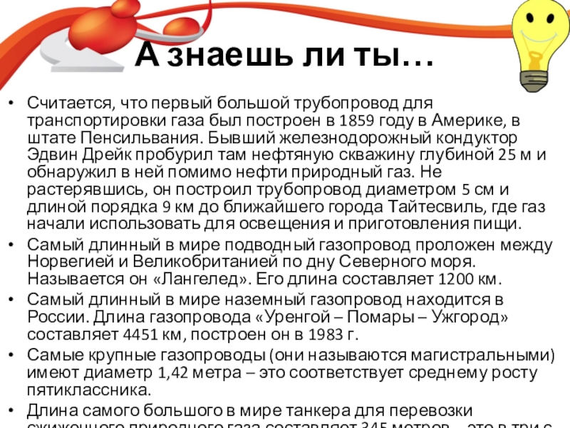 Самый длинный в мире подводный газопровод проложен между Норвегией и Великобританией по дну Северного моря. Называется он «Лангелед». Его длина составляет 1200 км.