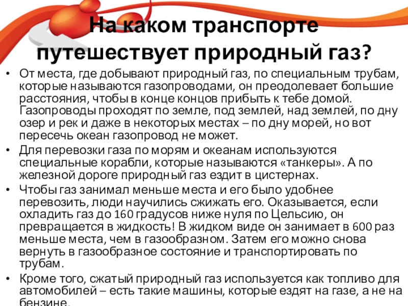 Чтобы газ занимал меньше места и его было удобнее перевозить, люди научились сжижать его. Оказывается, если охладить газ до 160 градусов ниже нуля по Цельсию, он превращается в жидкость! В жидком виде он занимает в 600 раз меньше места, чем в газообразном. Затем его можно снова вернуть в газообразное состояние и транспортировать по трубам.