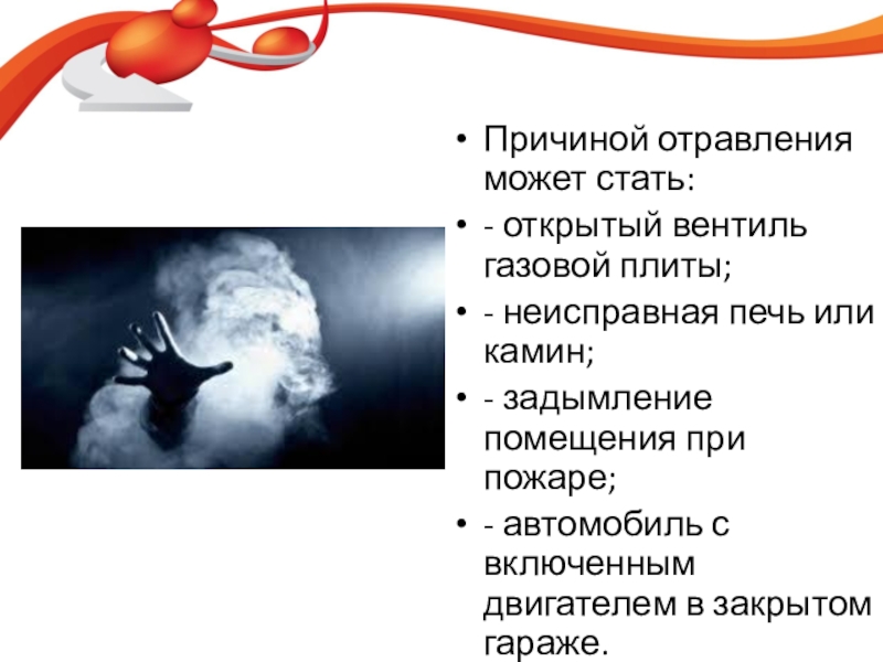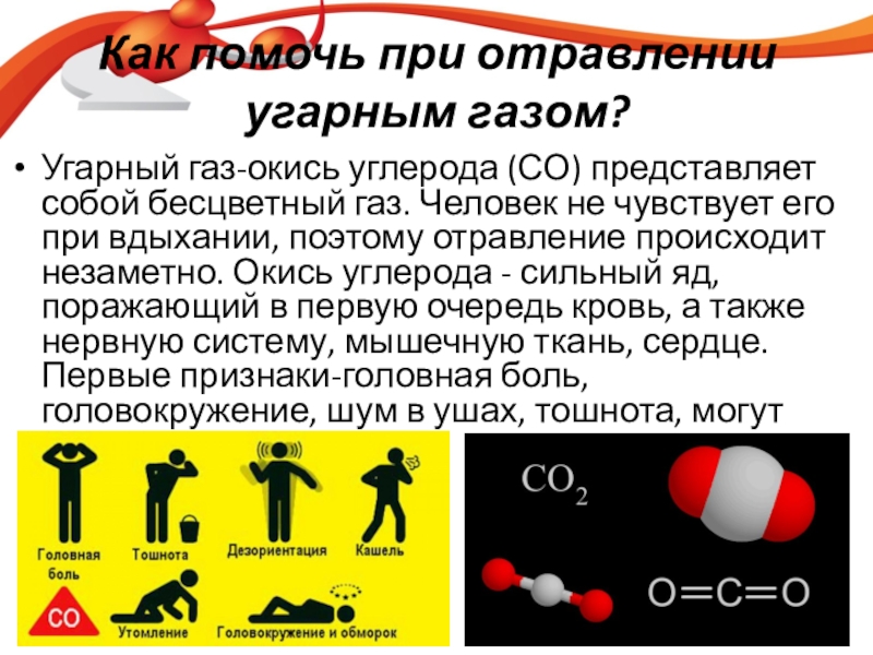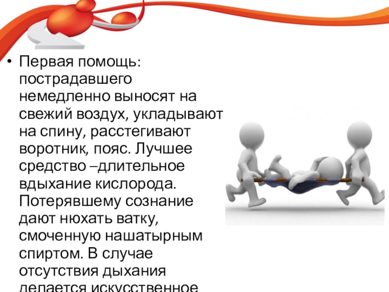 Слайд 30Первая помощь: пострадавшего немедленно выносят на свежий воздух, укладывают на спину,