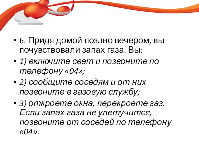 Слайд 366. Придя домой поздно вечером, вы почувствовали запах газа. Вы:
