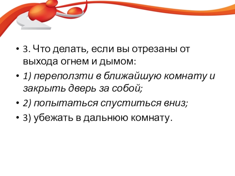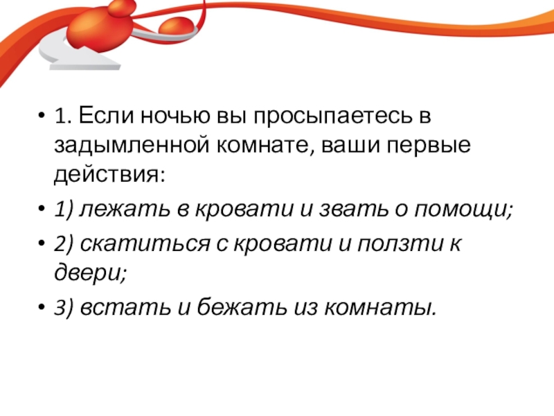 Слайд 321. Если ночью вы просыпаетесь в задымленной комнате, ваши первые действия: