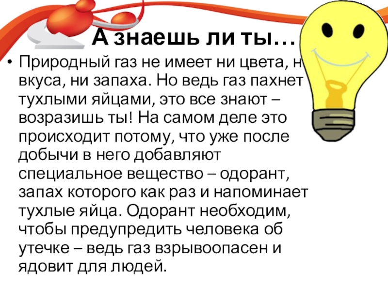 ни запаха. Но ведь газ пахнет тухлыми яйцами, это все знают – возразишь ты! На самом деле это происходит потому, что уже после добычи в него добавляют специальное вещество – одорант, запах которого как раз и напоминает тухлые яйца. Одорант необходим, чтобы предупредить человека об утечке – ведь газ взрывоопасен и ядовит для людей.