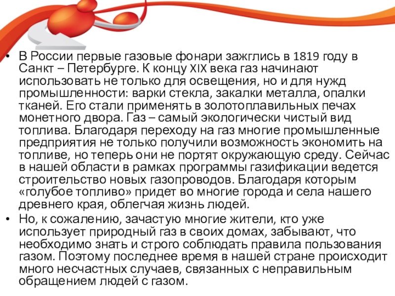 Петербурге. К концу XIX века газ начинают использовать не только для освещения, но и для нужд промышленности: варки стекла, закалки металла, опалки тканей. Его стали применять в золотоплавильных печах монетного двора. Газ – самый экологически чистый вид топлива. Благодаря переходу на газ многие промышленные предприятия не только получили возможность экономить на топливе, но теперь они не портят окружающую среду. Сейчас в нашей области в рамках программы газификации ведется строительство новых газопроводов. Благодаря которым «голубое топливо» придет во многие города и села нашего древнего края, облегчая жизнь людей.