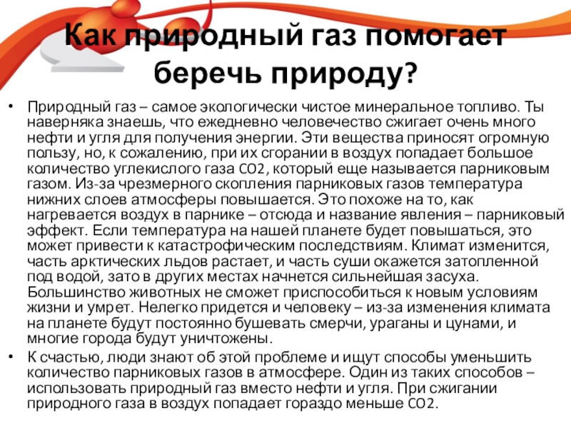 К счастью, люди знают об этой проблеме и ищут способы уменьшить количество парниковых газов в атмосфере. Один из таких способов – использовать природный газ вместо нефти и угля. При сжигании природного газа в воздух попадает гораздо меньше CO2.