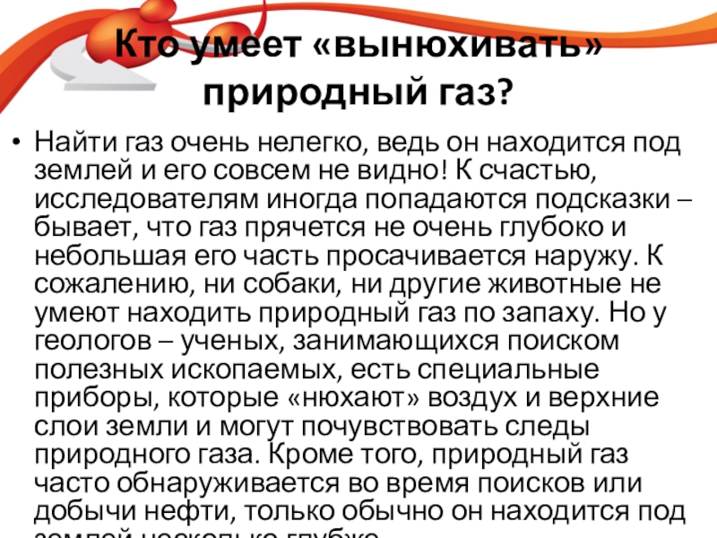 землей и его совсем не видно! К счастью, исследователям иногда попадаются подсказки – бывает, что газ прячется не очень глубоко и небольшая его часть просачивается наружу. К сожалению, ни собаки, ни другие животные не умеют находить природный газ по запаху. Но у геологов – ученых, занимающихся поиском полезных ископаемых, есть специальные приборы, которые «нюхают» воздух и верхние слои земли и могут почувствовать следы природного газа. Кроме того, природный газ часто обнаруживается во время поисков или добычи нефти, только обычно он находится под землей несколько глубже.