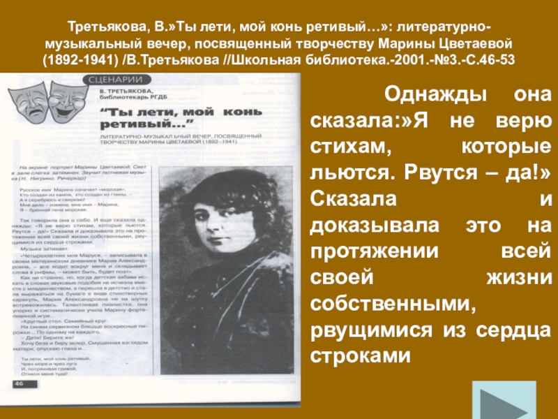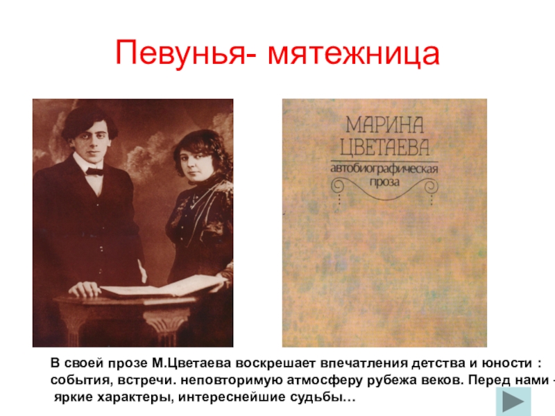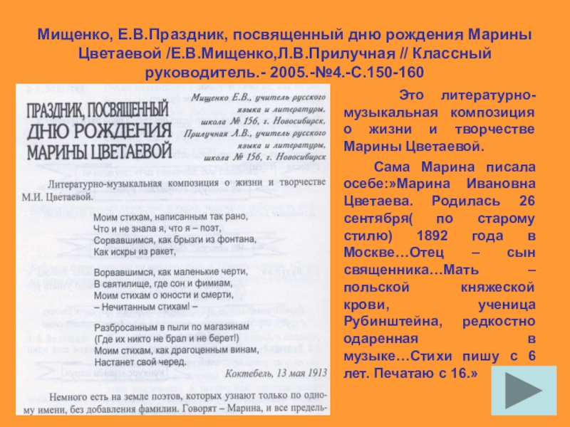 Это литературно-музыкальная композиция о жизни и творчестве Марины Цветаевой.