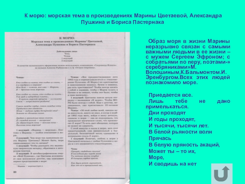 Образ моря в жизни Марины неразрывно связан с самыми важными людьми в ее жизни – с мужем Сергеем Эфроном; с собратьями по перу, поэтами-»серебряниками»М.Волошиным,К.Бальмонтом.И.Эренбургом.Всех этих людей познакомило море.