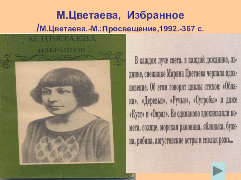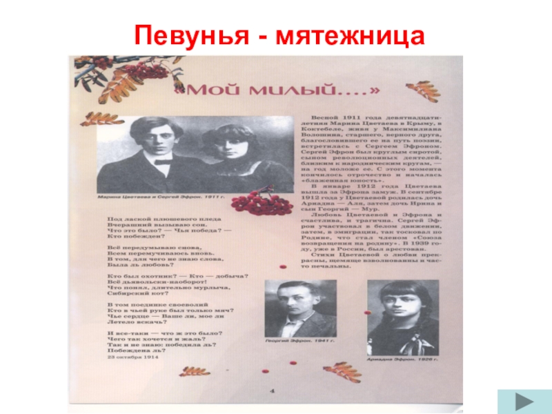 Сама Марина писала осебе:»Марина Ивановна Цветаева. Родилась 26 сентября( по старому стилю) 1892 года в Москве…Отец – сын священника…Мать – польской княжеской крови, ученица Рубинштейна, редкостно одаренная в музыке…Стихи пишу с 6 лет. Печатаю с 16.»