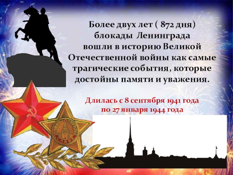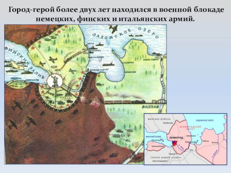Слайд 3Город-герой более двух лет находился в военной блокаде немецких, финских и