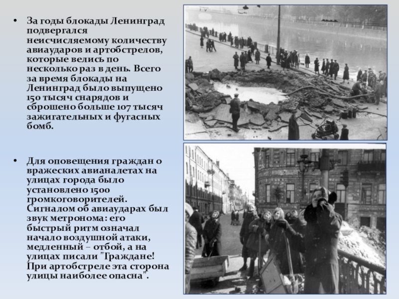 Для оповещения граждан о вражеских авианалетах на улицах города было установлено 1500 громкоговорителей. Сигналом об авиаударах был звук метронома: его быстрый ритм означал начало воздушной атаки, медленный – отбой, а на улицах писали "Граждане! При артобстреле эта сторона улицы наиболее опасна".