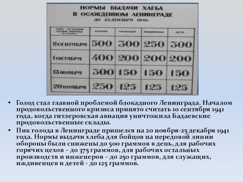 Пик голода в Ленинграде пришелся на 20 ноября-25 декабря 1941 года. Нормы выдачи хлеба для бойцов на передовой линии обороны были снижены до 500 граммов в день, для рабочих горячих цехов – до 375 граммов, для рабочих остальных производств и инженеров – до 250 граммов, для служащих, иждивенцев и детей - до 125 граммов.