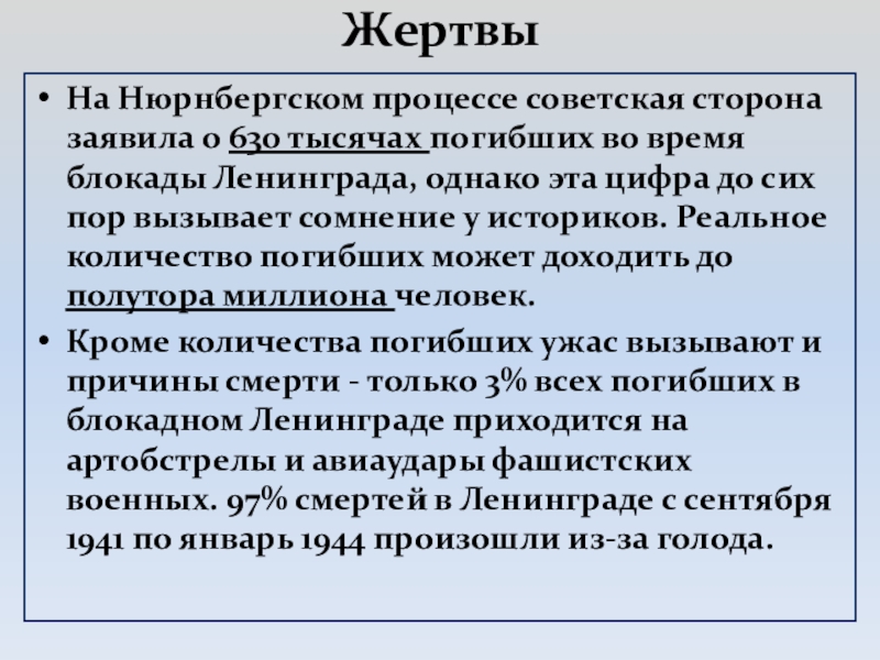 Кроме количества погибших ужас вызывают и причины смерти - только 3% всех погибших в блокадном Ленинграде приходится на артобстрелы и авиаудары фашистских военных. 97% смертей в Ленинграде с сентября 1941 по январь 1944 произошли из-за голода.