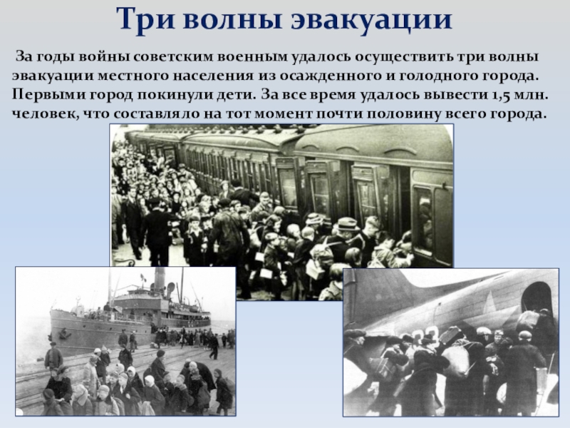 волны эвакуации местного населения из осажденного и голодного города. Первыми город покинули дети. За все время удалось вывести 1,5 млн. человек, что составляло на тот момент почти половину всего города.
