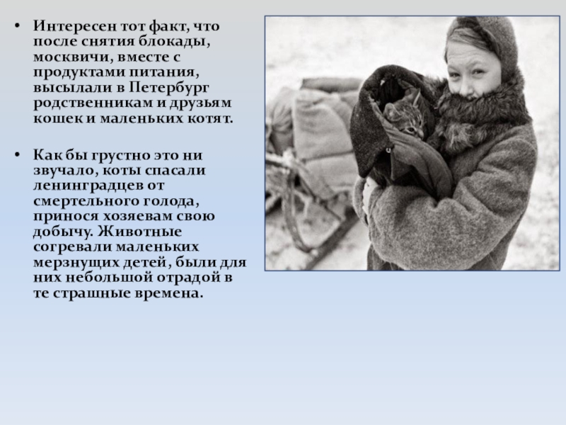 Как бы грустно это ни звучало, коты спасали ленинградцев от смертельного голода, принося хозяевам свою добычу. Животные согревали маленьких мерзнущих детей, были для них небольшой отрадой в те страшные времена.