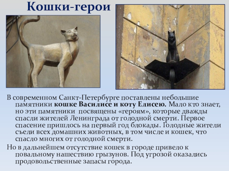 Мало кто знает, но эти памятники посвящены «героям», которые дважды спасли жителей Ленинграда от голодной смерти. Первое спасение пришлось на первый год блокады. Голодные жители съели всех домашних животных, в том числе и кошек, что спасло многих от голодной смерти.