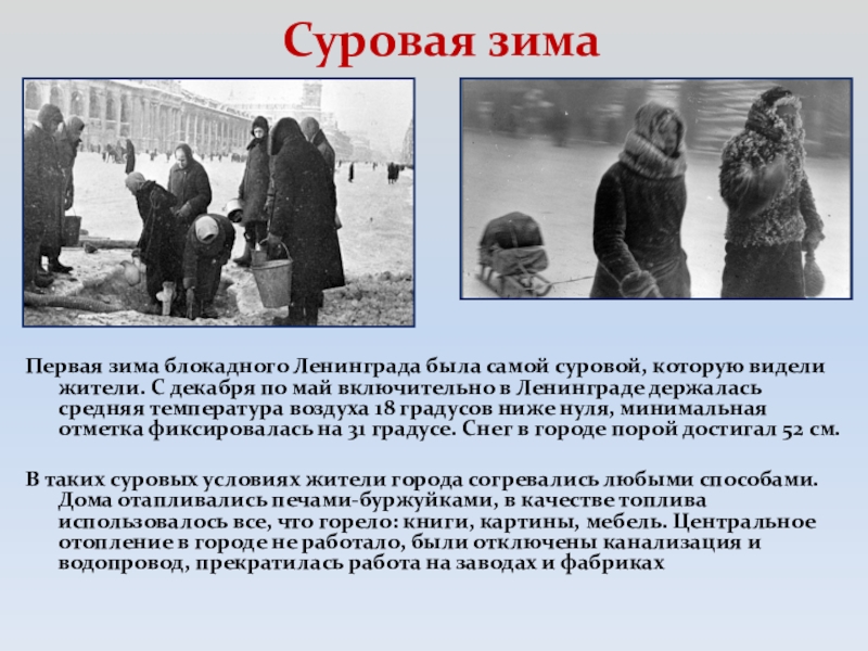 В таких суровых условиях жители города согревались любыми способами. Дома отапливались печами-буржуйками, в качестве топлива использовалось все, что горело: книги, картины, мебель. Центральное отопление в городе не работало, были отключены канализация и водопровод, прекратилась работа на заводах и фабриках